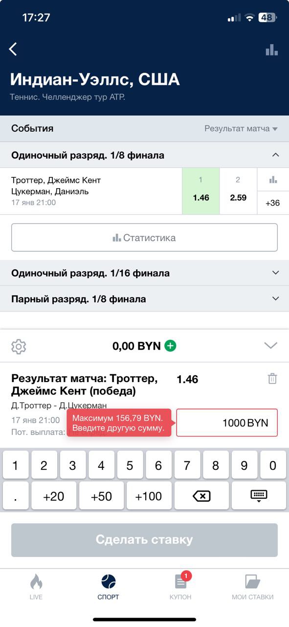Я занимаюсь ставками на спорт почти восемнадцать лет. И до прошлого года мои финансовые результаты были в районе нуля или был небольшой минус. Я делал ставки в двух крупных БК (Бетсити и Марафон), проблем не было: ставки в 1000 рублей принимали практически всегда. Однако в прошлом году мне удалось выйти в существенный плюс; то же удалось и в январе этого года – и мне ограничили лимиты ставок, порой до 10 рублей, а также отменили бонусную систему. После этого я зарегистрировался в много рекламируемой Бетере и сделал единственную ставку на 1000 рублей, которая выиграла. Теперь мой лимит там – 1 рубль. Отмечу, что я не занимаюсь букмекерскими вилками (арбитражем). В качестве подтверждения ограничения лимитов прикладываю скриншоты с указанием максимального размера ставки на одни и те же события в одно и то же время для меня и другого игрока с неуменьшенными лимитами в БК Марафон.